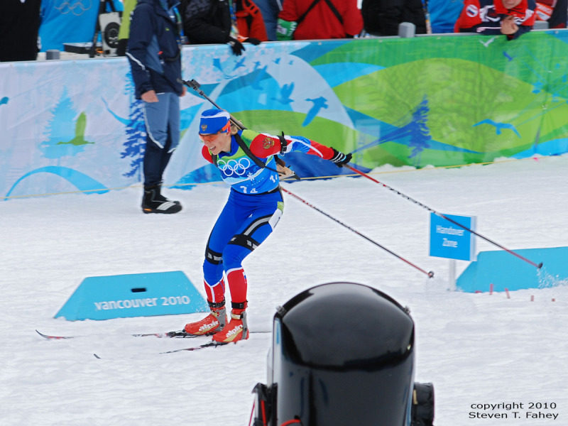 I went to the olympics in Vancouver with a Nikon D80 and a 200mm telephoto lens. During some events I wished I had a longer lens, but, then, waving around a long camera while in the stands seemed to get on the nerves of some people around me, so I tried to be more discreet. Hard to be discreet if I had a 400. Most events had plenty of elbow room for us shutterbugs, like biathlon: