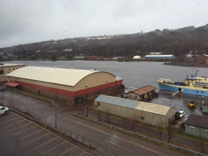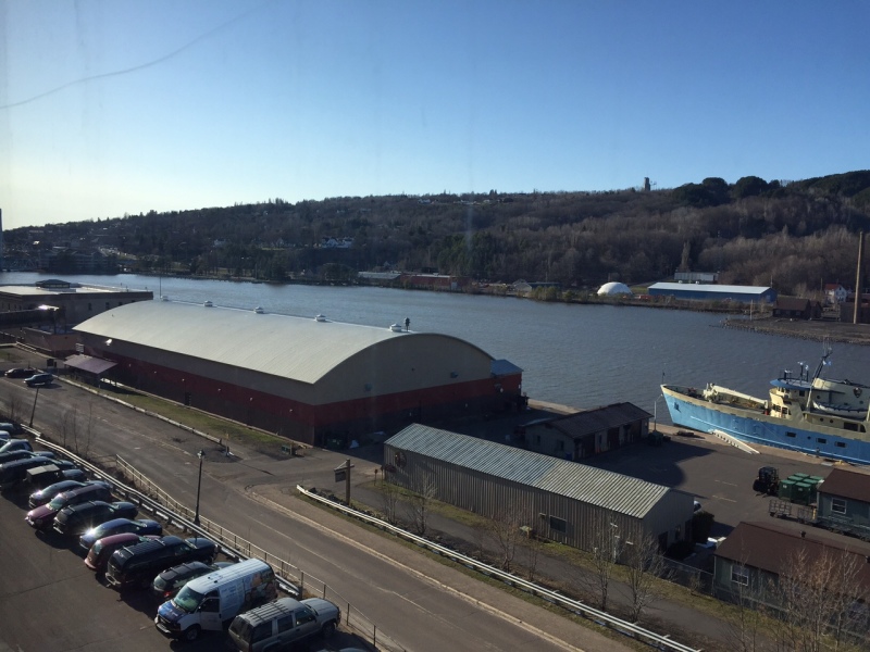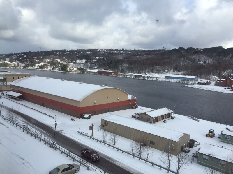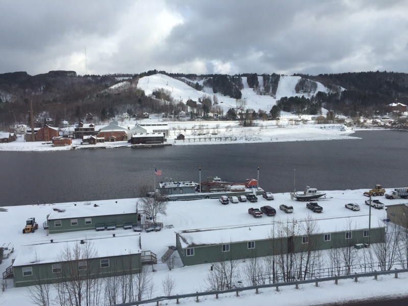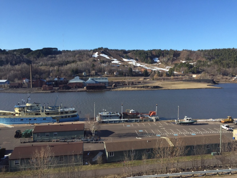 What you see across the lake (it may look like a river but it's really a lake) is the university's ski hill. Down by the water is an old copper smelting site which has been shut down since after WWII, but is being cleaned-up and will eventually be opened as part of a national historical site perserving some of the history of copper mining in the area.