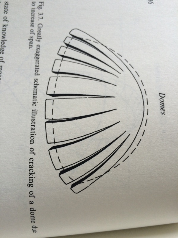 I recently read an account of how the Orange Peel hypothesis of cracked domes allows the St. Peter's dome to remain viable post spread (pic below). It's fascinating. To some degree, this redistribution of load will take place even in a reinforced dome as it transitions to the cracked state. I'm not suggesting that you should design your dome this way. This is just fun shop talk. You can take some comfort from knowing that this two way arch behaviour is available as a last resort however.