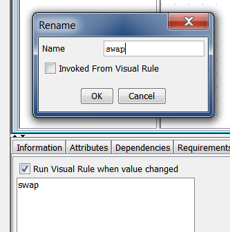 When creating the "swap" rule, you'd checked the little "Invoked From Visual Rule" box. This check indicates that the rule is going to be invoked only from other Visual Rules, and not invoked directly from the UI. In your example, your "swap_to_1" and "swap_to_2" rules are exactly this, and should have this checked, because each of them will only be used from the context of your conditional "swap" rule.
