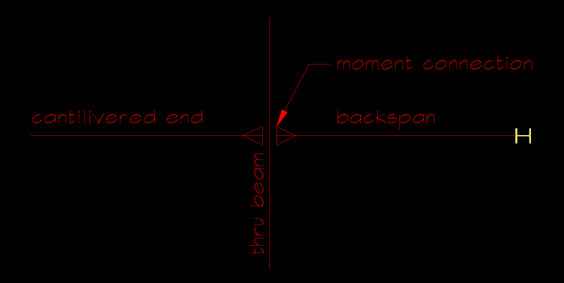 We have a typical detail for cantilevered beam conditions that has girder interrupting the cantilevered beam. The goal of the detail is to engage some backspan and use the thru beam as a pinned support through which the cantilevered out beam rotates.