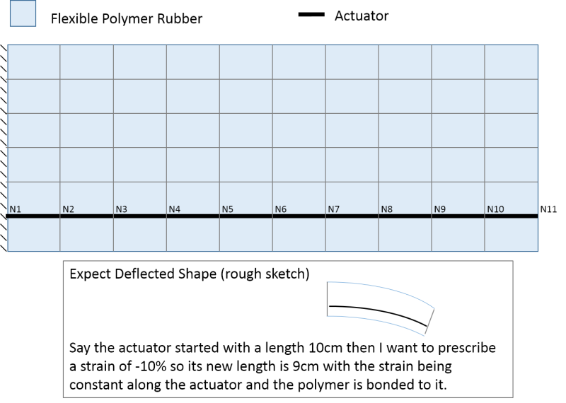 Currently I am working with a unique actuator which under the simplest explanation is like a small rope which we can control the contraction of. This actuator can easily be cast in flexible polymers and then used to control the shape/motion of the cast structure. In the past the FE models have simply used forces applied at each attachment point of the actuator. This is no longer really a valid solution due to the longer lengths used and the large deflections needed.
