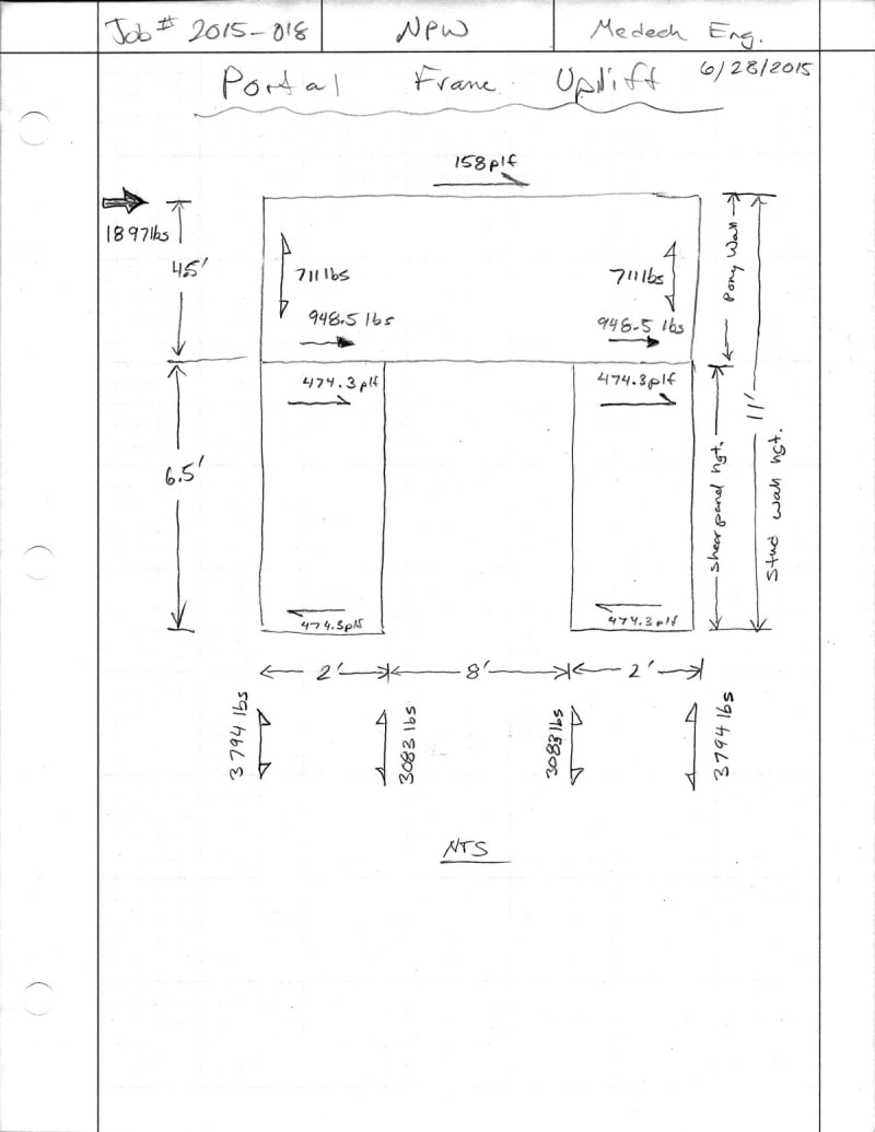 Assuming a portal frames header and pony wall act in a rigid manner can someone tell me if my free body diagram for the uplift at the holdowns makes sense. Compare with the uplift calculated by Shearwalls assuming segmented shearwalls at the two locations. The thing worth noting is the significant decrease in the uplift/overturning forces with the use of a portal frame. Mostly I'm just looking for a sanity check here in case I'm missing something.