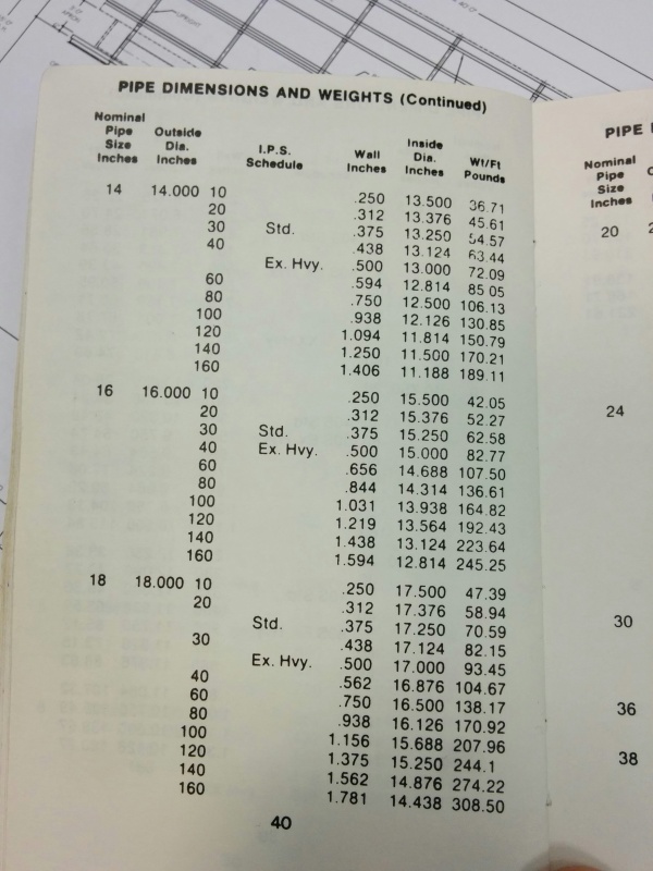 Does anyone have any information in regards to properties for 18" dia shc 40 pipe.... or pipes around this size? Trying to design a large monopole sign and the mfr would like to use this type of steel section. I have information on a round HSS 18x1/2", it appears of if the 18" sch 40 pipe is similar wall thickness, but I am not entirely sure.