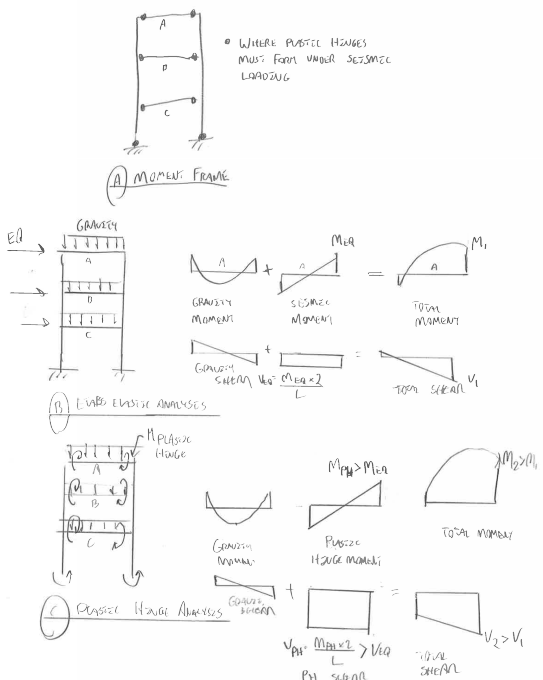 2) Ductile moment frames develop plastic mechanisms under seismic load.