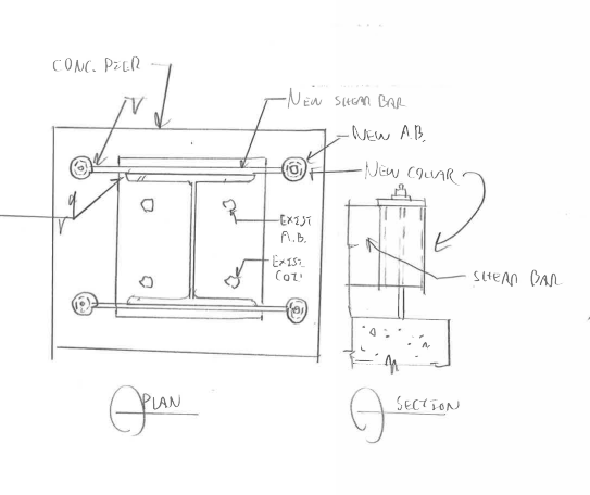 "These a/b should then be tied together by rectangular bars (?) subjected to shear only from the existing base plate during uplift. The ends of the bars will have a welded collar for the a/b(?)."