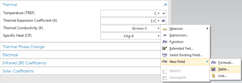 In the thermal expansion coefficient box, click on the equal symbol > New Field > Table