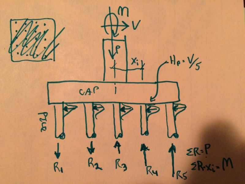 See the sketch below Akhilkp. Each pile in the sketch represents an out of plane row of piles. There are a lot of permutations of the concept depending on the assumptions made but the basic idea is the same. The shear is generally assumed to be resisted the piles uniformly and via lateral soil pressure near the top of the piles. The axial loads in the piles can be determined using a point support version of P/A + M/Sx or P/A + M/Zx if the cap can be assumed to be rigid.