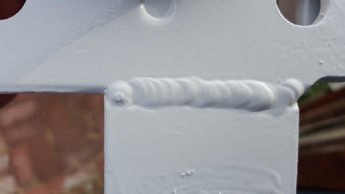 My first weld in about two years. I wasn't enjoying myself before because my eyes are not so great close up anymore. (I used to be able to see protozoa with my naked eyes.) (Those were the days) But, this time I put on my reading glasses inside my helmet. WOW! Fun again.
