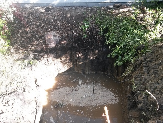 Things started to go wrong on the day I excavated the hole. The actual excavation went smoothly (mini-excavator from Home Depot did the job in 1.5 hours). But it was pouring rain the whole time. Following that downpour came another heavy rain that added up to about 60 mm of rain. This is very unusual for Calgary, by the way. Just my luck. The pit filled with 2 feet of water, receiving not only the direct rainfall but also run-off from the garage roof which I didn't think of diverting. I sump-pumped it to 6 inches and allowed another week for it to dry out.