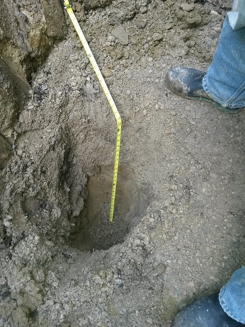 This weekend I tried putting in the gravel base, but I was dismayed to find that the gravel never became firm. It just adopted the texture of mud. By hand, I dug down to see what was underneath. The gravel/mud mix was about 6" deep, below that was like clay, and below that seemed to be sand. Then why did it take a week to drain the last few inches of the water? I'm thinking the sand is so fine, and mixed with clay, that it can't drain quickly. Even though it looks and feels like sand. Pressed between my fingers the deepest sand is granular, and does not smear mud on my fingertips. Why didn't it drain water from above? I do not know where the water table is, but this hole at the bottom of the excavation added up to 6 feet below grade and it did not fill with water.