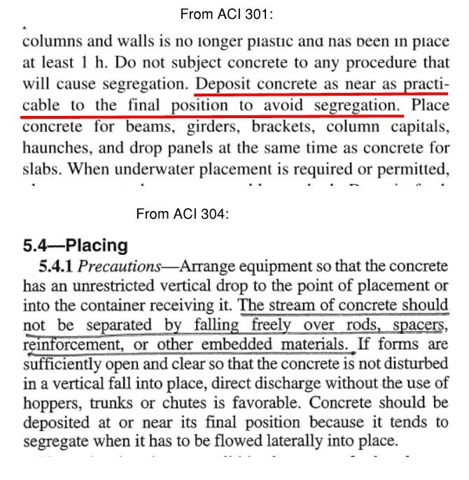 The main concern I've seen with regards to segregation isn't necessarily with free fall, but with horizontal transportation as the last sentence in JAE's second screenshot states. The intent of ACI 301 in my eye isn't for you to pour columns and walls in lifts or stick your conveying equipment down into the forms. It's more to not deposit all concrete for a long length of wall or slab in one spot tens of feet away and then move it into place from there.