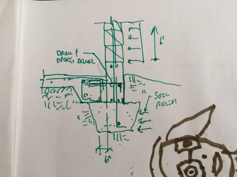 Im designing a simple free standing 14cm cmu 3m tall wall, I need to bounce some ideas with anyone that has an insight or opinion on this matter. This wall will serve as an enclosure for an existing slab on grade due to several reasons we were asked not to modify the slab on grade and just add the enclosure around it. Although I understand that there are several ways to solve one problem and several things, to consider like cost and construction time, I would like to focus on design.. I have attached the existing conditions with two options.