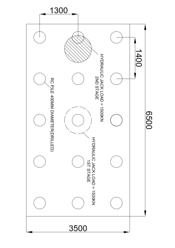 Pilecap details (6.5m x 3.5m x 0.5m THK) supported by 15 piles 400mm diameter and 9m deep. Load will be coming from a hydraulic jack but is not a long term loading. In short this is a jack foundation and the jack will be placed at the center in the first jacking and will move in the second jacking (as shown).