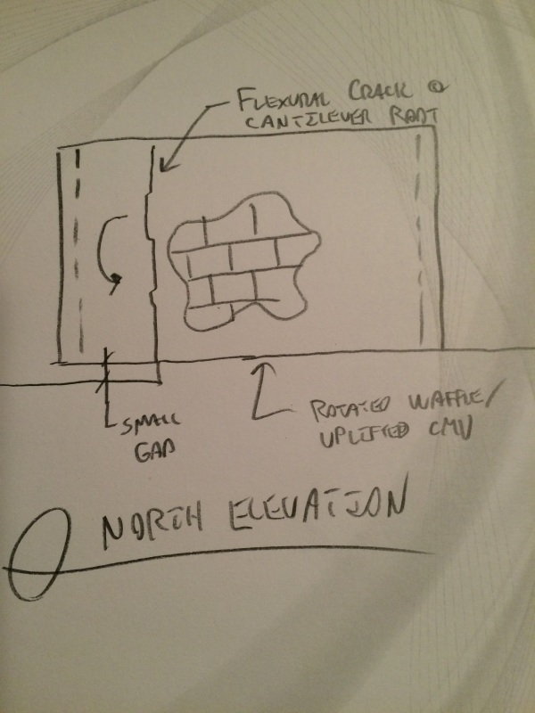 My feeling is that the crack has something to do with deflection because the crack I believe gets a little narrower at the top of the wall than at the bottom. Also, if the wall deforms as per your drawing, I would expect that this would cause the the portion of the wall to the west of the crack to be displaced northward relative to the portion of the wall to the east of the crack. The opposite is what I see on site.