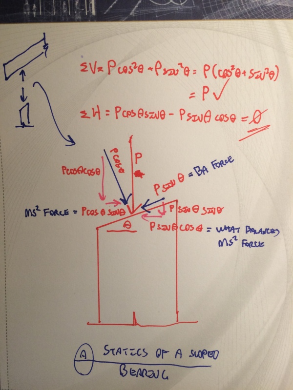 The sketch below shows my statical analysis of a sloped bearing condition. In essence, it's a convoluted way to say that you can't squeeze a horizontal reaction out of a vertical applied force.