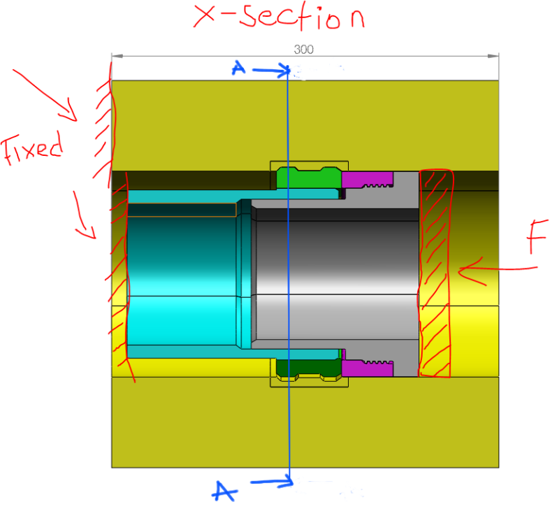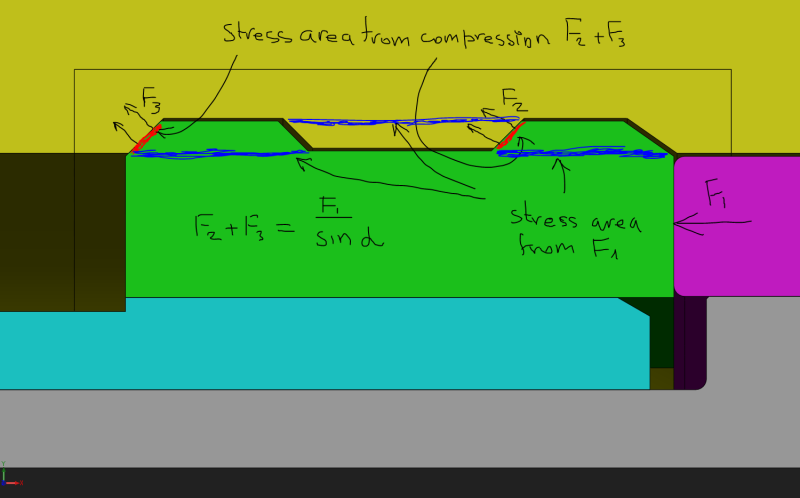 there is a cylinder with two internal grooves (yellow part). 5 Dogs are equally spaced (72deg.) inside that cylinder. They are being pushed by the Force against the grooves in the cylinder. What stresses i have to calculate to make sure the construction is stable with applied Force. And what equations I need to use.