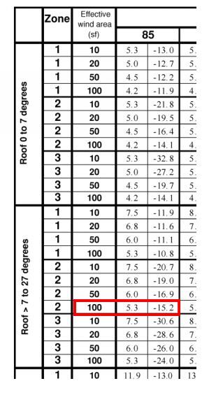 So the 26 psf that the OP used - not sure where it came from - there is a 26 psf for zone 3 at 50 sf but for >100 sf it should be 15.2 or 24 psf for 2 and 3 respectively.
