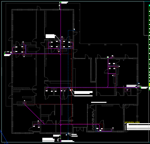 This appears to be a single floor building, as such all this will be underground and does not need to follow the main 'square' lines of the building. This is because you will be supporting the piping from structure which usually does. Running certain piping NE/SE/SW/NW can save on piping/trenching also.