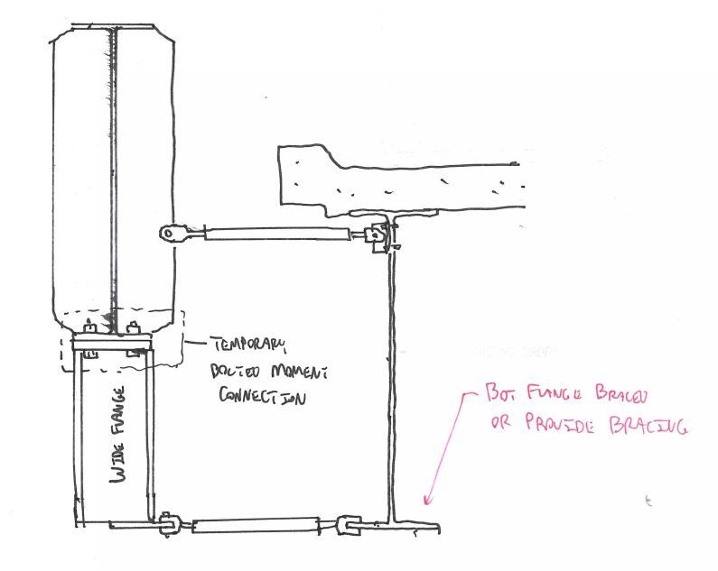Please be cautious with any lateral bracing arrangement - you have to be sure that the steel structure can deflect as anticipated when the deck is placed. KootK had suggested a moment connection between the stub and the (existing?) girder stiffeners. That may not be wise unless I'm coming into this thread a bit late and am missing something. Perhaps all of the temporary connections to the existing bridge are to be removed before the deck is placed, making my comment moot.