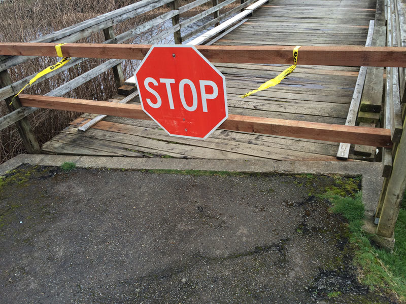 I think the reason this bridge was never condemned years ago was that no one ever actually looked at it and the owner kept applying small fixer uppers to keep it from having any major issues. There are numerous repairs and even some of the main beams have been replaced, all without permitting or approval. The first thing I did was condemn it and subsequently the City roped it off. It doesn't take an expert to say something is wrong when you can take a screwdriver and physically push it all the way through a 5-1/2" glulam beam. However, it did take a formal letter to the City citing life safety concerns before any action was taken. Given the state of the bridge I would say the repairs are 10-15 years past due, and the City is very lucky that there has not been a catastrophic failure which would have resulted in serious injury or death.