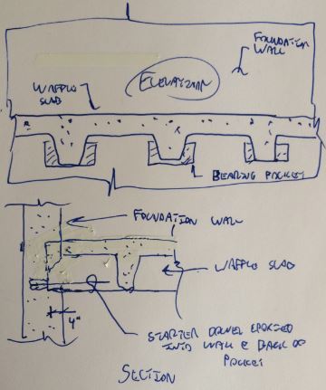 Re: Hanging the waffle rib from the 2.5" slab - The edge of the floor is a solid slab the same thickness as the waffle stem + slab. The width of this solid edge depends on which side of the building it is on, but it is not less than 15". So this should give some substantial thick slab to transfer the rib reaction to the adjacent rib.