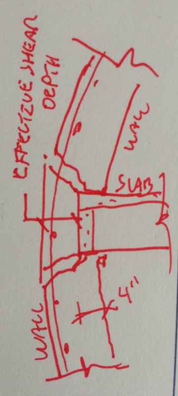 A 50+ year old 2 storey below-grade parking garage (under a superstructure tower), is in need of structural repairs to the floor of the intermediate level parking floor. This floor is a shallow (7½" deep) waffle slab with ribs at 2 foot centres each way. In some cases, the repair requires floor thru-slab removal for a significant length parallel and adjacent to the supporting exterior wall. The existing floor-to-wall dowels are only #3@24". The factored reaction at the wall is a maximum of 2100 pds per foot, or 4200 pounds per waffle rib (the waffle ribs are at 2 feet centres and span 23'-8"± clear)