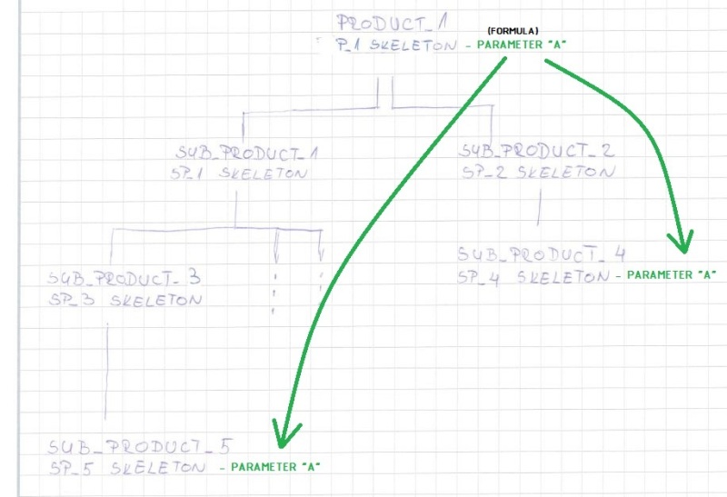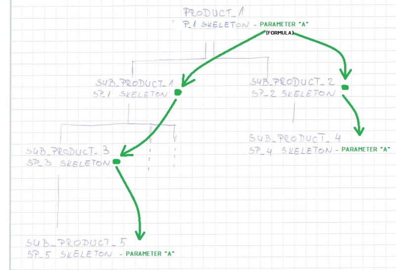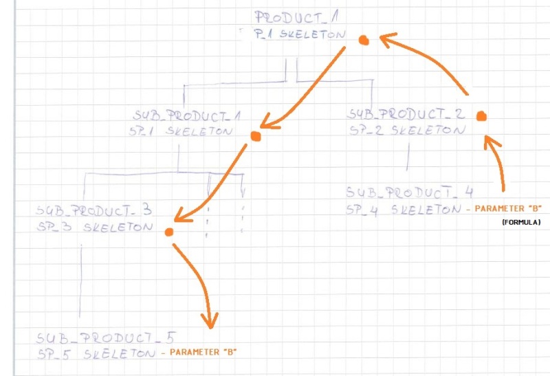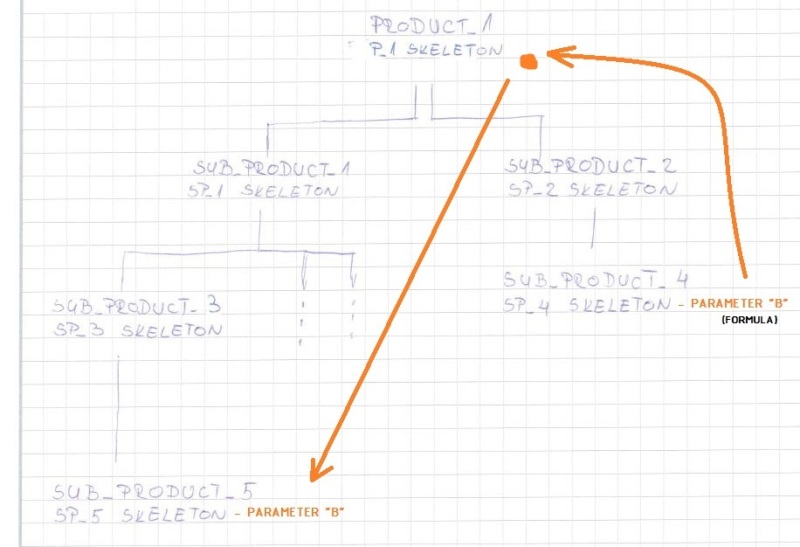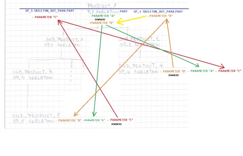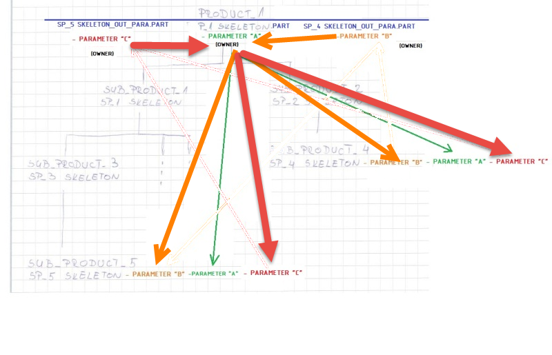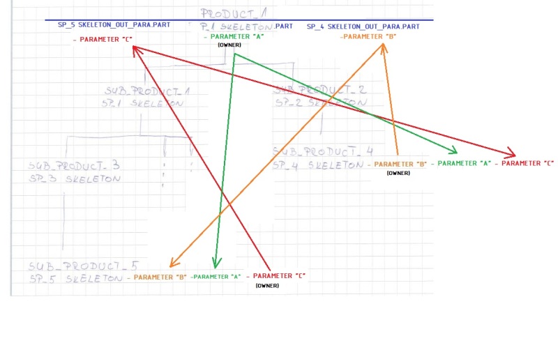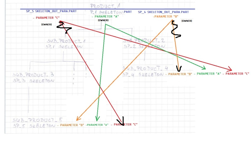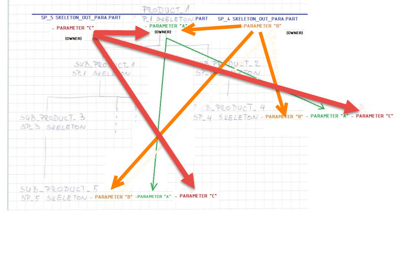 Let's say that master GREEN is the owner of parameter "A" and parameter "C". ORANGE is the owner off parameter "B". For the definition of value "B", ORANGE needs (in some aspect) value of parameter "A". He gets this with link GREEN --> ORANGE. Master GREEN on the other hand needs parameter "B" for creation of parameter "C". Does this mean that "A" and "C" can not be created in same file? This would also mean that master GREEN has to have two skeleton parts at same level as "sub product 1" and "sub product 2"(directly under root product)?