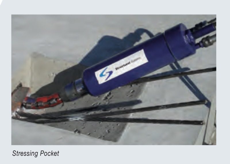 Also, for bonded tendons, a single (or twin ram) center-hole jack is usually used, whilst for UNbonded a open-throat (saddle) jack must be used to access the intermediate pour tendons without 'threading' the jack over the remaining length of unplaced strand.