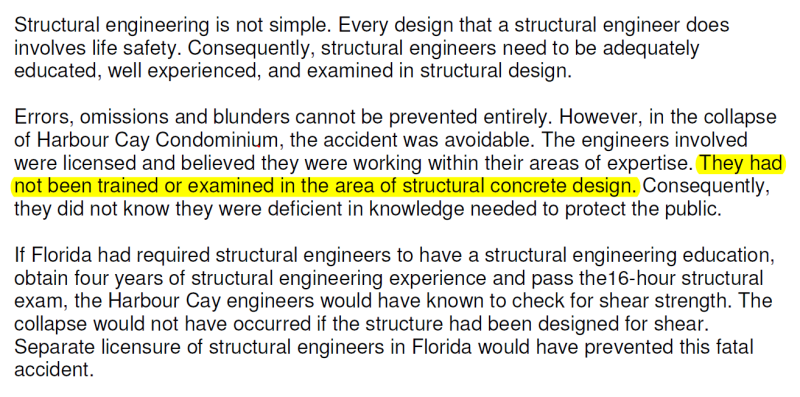 I'm not sure I completely agree with Corley. The SE does not guarantee that mistakes won't be made, though I do agree that the more rigorous the exam process, the lower the chance of missing one of the "fundamentals" of a design. I'm pretty sure that when that failure occurred, there was no SE licensure. I was hired by an attorney for the rebar producer to review the rebar shop drawings and compare to the design. Had just gotten started when the whole thing was settled.