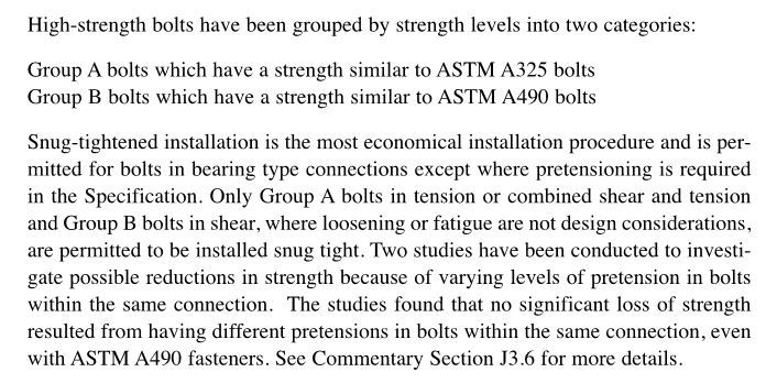 One of the issues we deal with in construction is the lax procedural methods of "snug tight". Faying surfaces are to be brought into full contact! I see many times that unless there is greater specificity in the tensioning specification, this does not occur. ALL high strength bolts are to be tightened to a "snug tight" condition, at least. A non-specific requirement at best, other than the faying surface requirement.