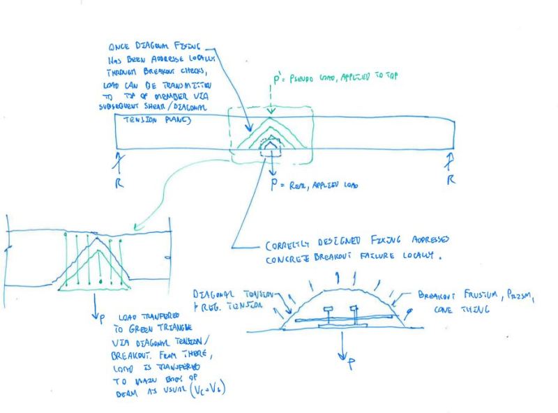 3) I don't currently take Vc in addition to Vs. I've come to believe that there's something fundamentally different about shear and tensile anchorage applications. Clearly, when you grab the entire concrete section, it's conventional shear. And if anchorage provisions are to be believed then, when you only grab a little chunk of the section, it's not conventional shear. Where in between those two extremes doe it switch over? I don't know.