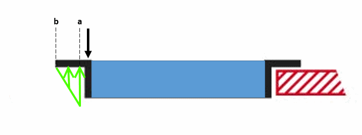 I have a situation basically like this picture. It is essentially a vent installed into an opening with a flange around the perimeter that bears on the surrounding of the opening - nothing else holding it in placce. A pressure on the face results in a distributed load on the perimeter which I represented on the picture with the black arrow. It is pretty much constrained from moving horizontally except for a small gap around the perimter between the frame and the opening. So my question is, when it comes to checking the bending of that flange, what would one use as the dimension of the moment arm? The distance from the black arrow to 'a' or the black arrow to 'b'?