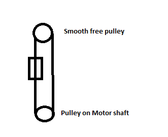 The pulley is on the motor shaft . On the other end of the belt is a roller. The two rollers near the