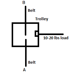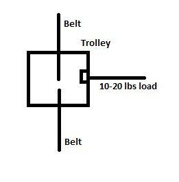 The object is a trolley. Both belt ends are fasten on the trolley. The trolley carries 10-20 lb rod.