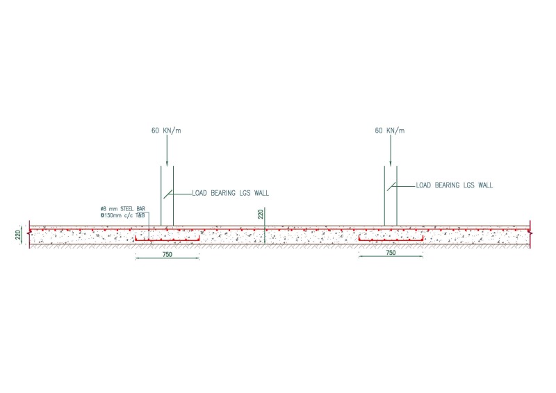 I am designing a raft footing for light gauge steel building (thickness 220 mm). I am placing the top reinforcement continuously in whole slab but I want to place the bottom reinforcement only where i have the load bearing wall (as shown in below sketch) so my question is that to calculate the bottom reinforcement I designed this as strip footing and 750mm width of strip is enough according to my calculation , so accordingly I am placing the bottom reinforcement. Does this way is correct to calculate the bottom reinforcement in raft footing???