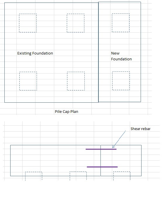 I have a existing four pile cap, It was decided to add two more new pile and join to the existing foundation by