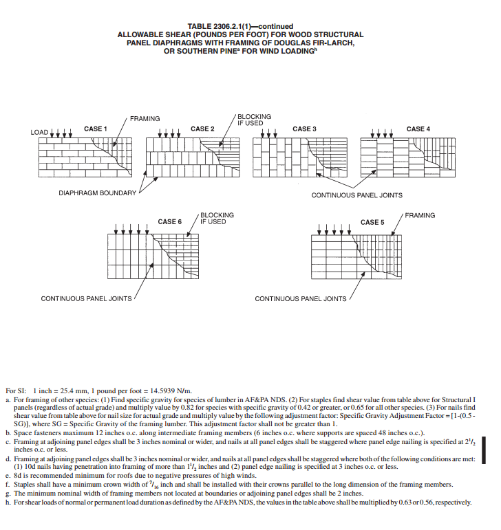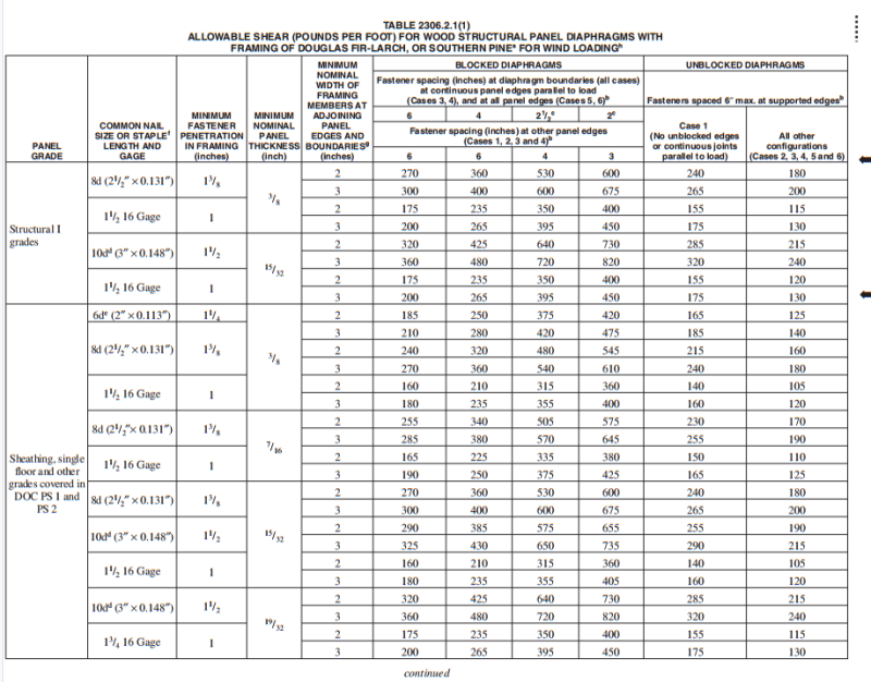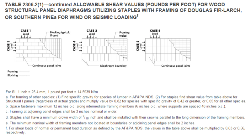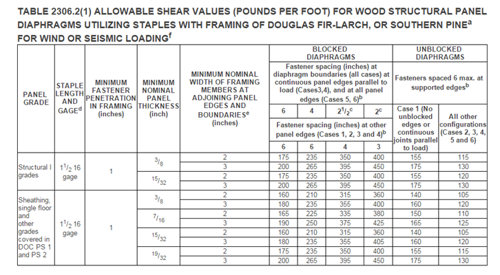 In the latest version of the FBC, Table 2306.2 (1) only includes allowable shear values for 1-1/2” 16 gage staples. However, in previous versions of the FBC, nails (whether 8d or 10d) and staples were included for allowable shear design values for structural diaphragms. My question is: Why? Why did nails get removed from the table? Is there any documentation I can follow that would provide me with nailing capacities? I cannot find anything within the code itself, or any other documentation online to explain the change.