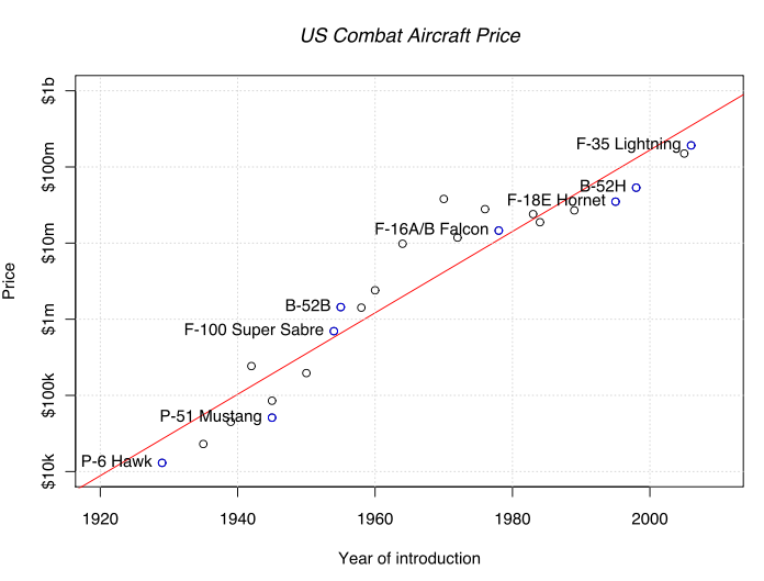 His most cited law is number 16, which shows that defense budgets grow linearly but the unit cost of a new military aircraft grows exponentially.