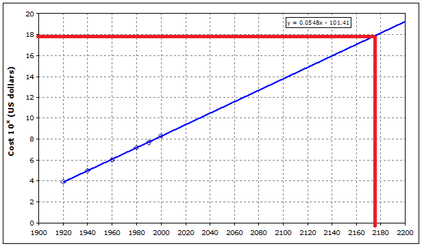 Augustine's Law number 16 has been extrapolated to estimate when the defense budget would increase sufficiently to afford to construct the Death Star - the ultimate weapon of Star Wars. The result is that the Death Star will be an affordable option for the US military in the year 2180. The graph below shows the extrapolation of 20th century data, with the vertical axis being exponents of 10.