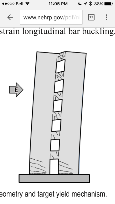 Not necessarily so. In a coupled shear wall system, the peak demand in the coupling beams is at the top rather than the bottom. This lends credence to motorcity's hypothesis (nice). And yours as I do in fact believe these to be permutations of flexural shear cracks.