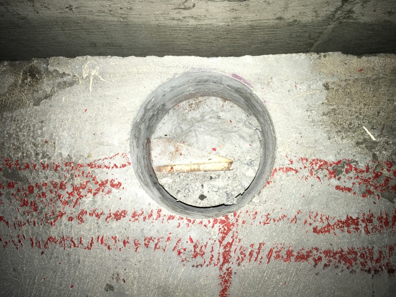 Here is a dead-end anchorage that was cored last month - drilled half-depth through the monostrand anchorage, one wedge, and the 7-wire strand released suddenly. Strand projected from the opposing live-end by about 3". Tendon was 50' long.