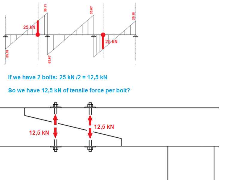 My question: is a tensile force (shear force from diagram)in bolts the only force you consider when designing a joint? Any other controlls you make beside contact pressures perpendicular to the grain flow (washers)?