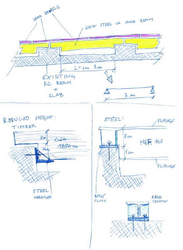 Im designing a new terrace so I need new steel or wood beam (they are 1,20 m apart). Spans between RC beams are not that large - cca 3 - 4 m. I already calculated beams - they can be from timber or steel. But Im wondering what problems / issues there may appear.