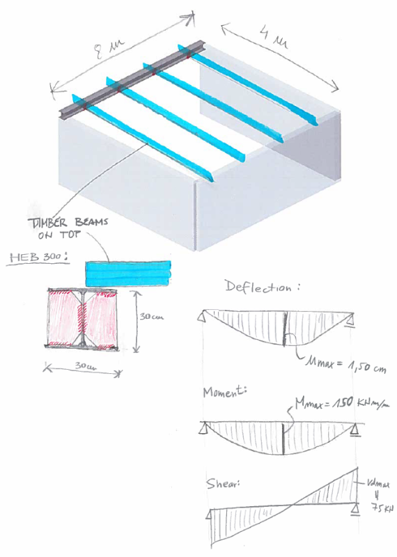 There are timber beams on top of steel beam (cca 1,30 m spacing between them),