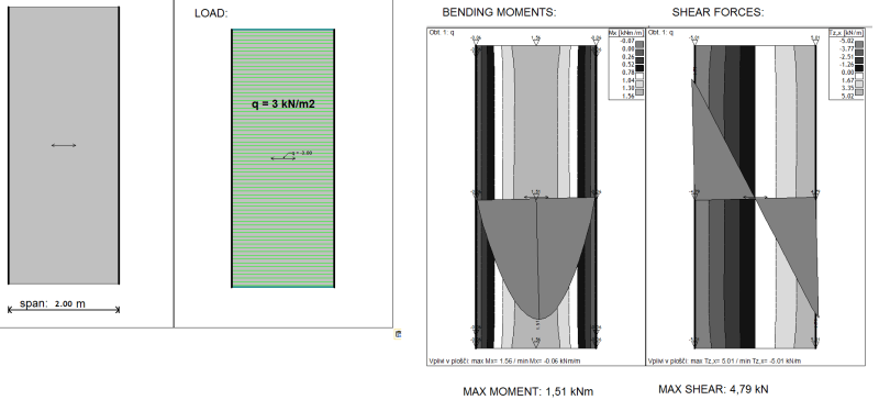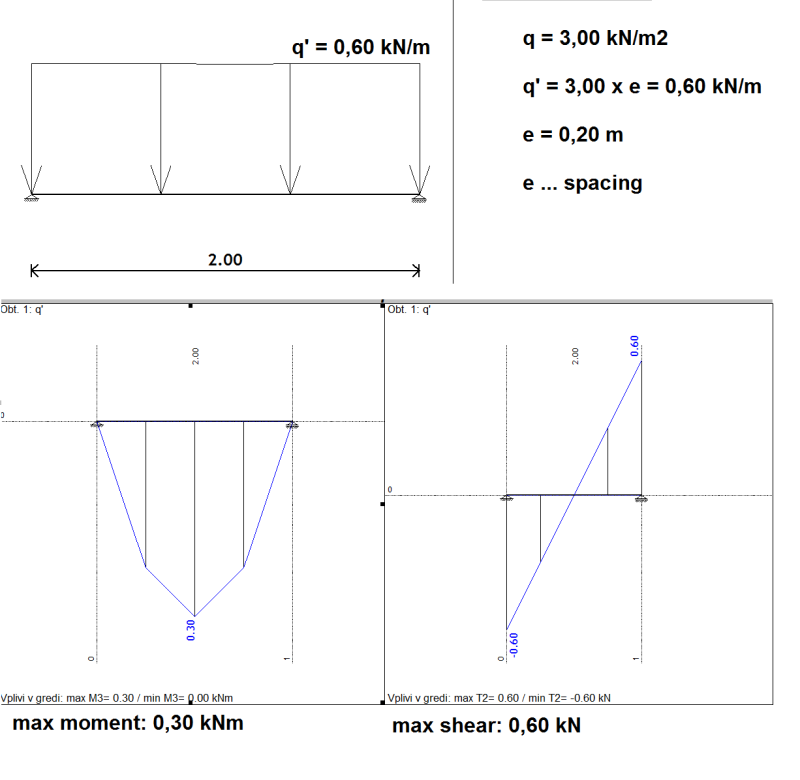 That means that a load per single wooden board is: q' = q x e = 3,00 kN/m2 x 0,20 m = 0,60 kN/m