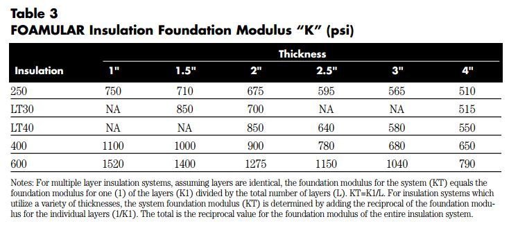 In this instance, the client is going to be putting 60psi compressive strength rigid insulation under the slab on grade and is asking me if this is OK. While this would normally raise a few eyebrows on my end, in this instance, we have some large moving loads on the slab and I am a bit worried about it. The slab was designed in accordance with the geotechnical report which gave a subgrade modulus of 200pci. I can't seem to find anything that will list either a subgrade modulus for the rigid insualtion or an equivalent E value.