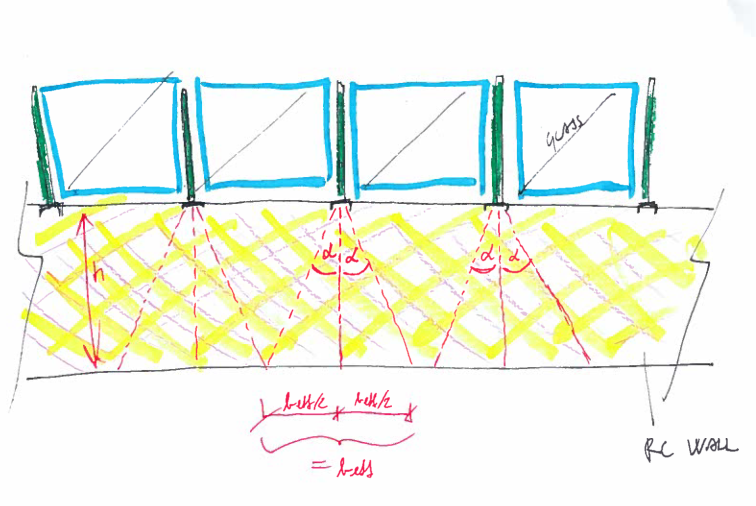 I need to determine effective width of a RC wall at the base (beff). I need this so I can control if existing reinforcement at the base is sufficient. What should be taken for ALPHA? I was thinking about 30o