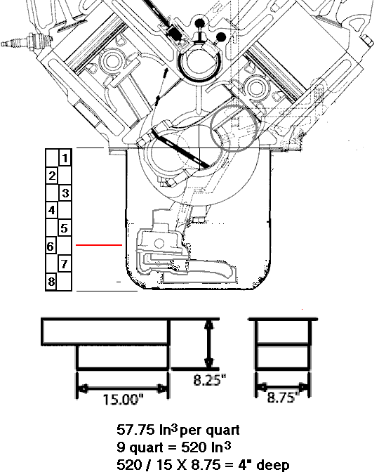 For example, my illustration shows where someone measured to their dipstick FULL mark (with the pan off) and was 5.5” below the crank centerline. Thus with that as FULL, the shown advertised 9 quart pan would only need less than 5.5 quarts to show full.