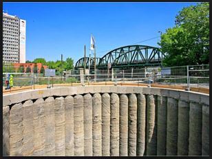 The horizontal precast concrete members are stacked one-at-time, joint sealed - then backfilled, before placing the next horizontal member.